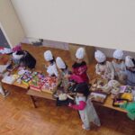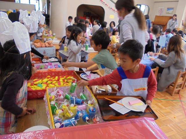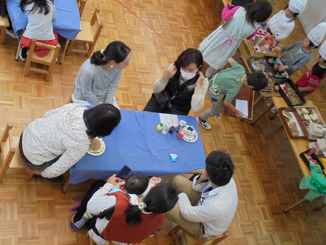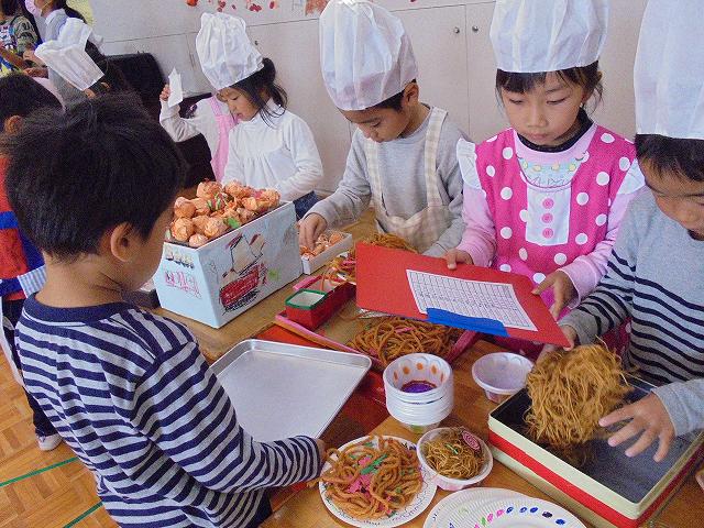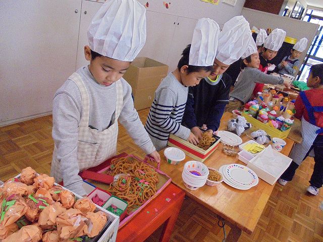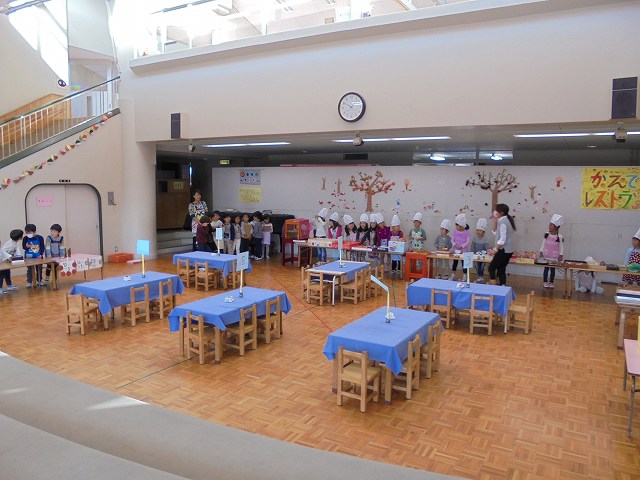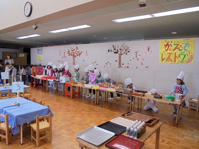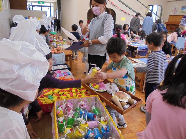 バザーの後、お店屋さんごっこが盛んになることが多いですが、今年は、レストランごっこが始まりました。保育参加日を目標に品物を作ったり、どんな役割が必要なのかなどを考えて準備してきました。