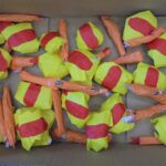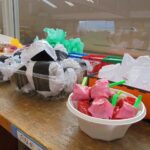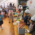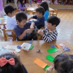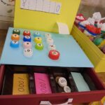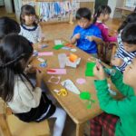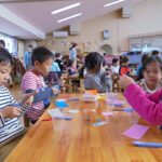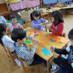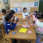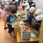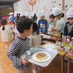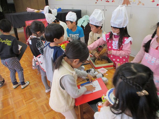 年長組保育参加日に開店した、かえでくみレストランが今週は続きます。年長組の子どもたちと作ったいろいろな品物が並びスタートです。役割は交代しますが、注文を受けた子どもたちはクリップバインダーに付けたメニュー表と品物を確認しながら、テーブルに」届けていました。