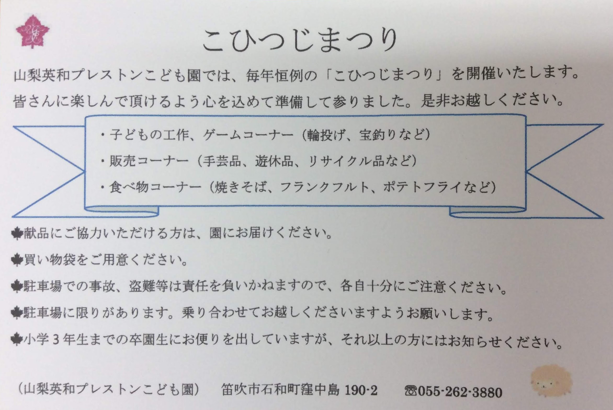 山梨英和プレストンこども園では、毎年恒例のこひつじまつりを開催いたします。