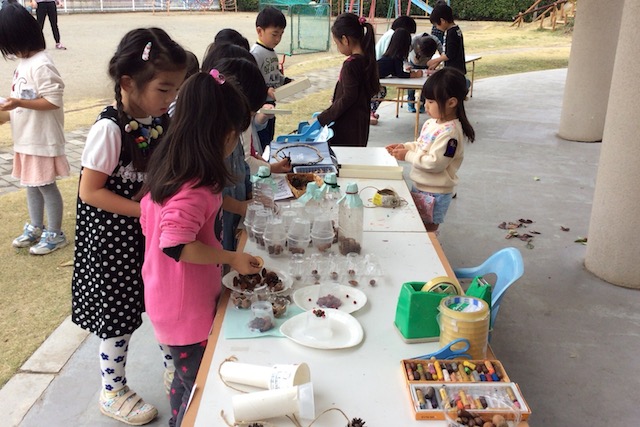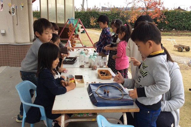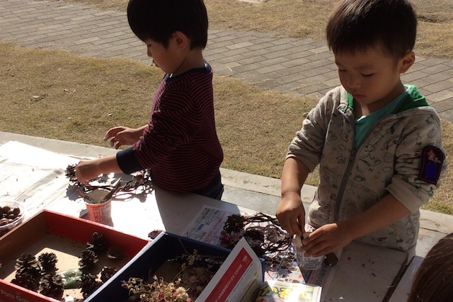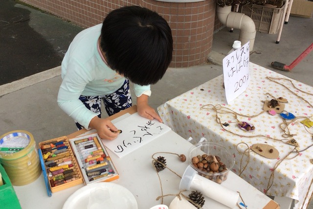 2015/12/09 こひつじ 秋の遊びのコーナーより(幼稚園部) こひつじまつりを楽しんだ後、 秋の自然物を使ってお店屋さんごっこを楽しみました。 自然物や空き箱を使って品物を作りました。 異年齢の友だちとの関わりもたくさんあります。 遊びの中で「字を書くこと」を楽しみます。 色々な品物が並んでいます。 「いらっしゃい!」「これはどうやって使うんですか?」・・・やりとりを楽しんでいます。 買ったおもちゃで遊ぼう! 自然物製作も盛り上がりました。 秋の実を使って、リース作り。 前の記事を見る 記事一覧に戻る 次の記事を見る