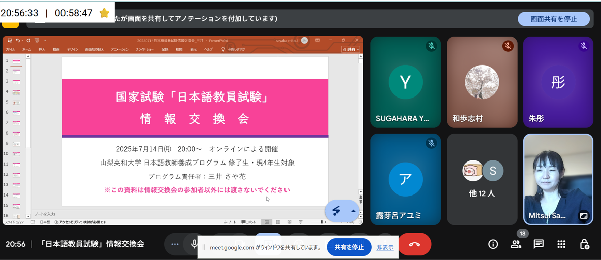 2025年7月14日(月)、国家試験「日本語教員試験」の情報交換会がオンラインで行われ、本学在学生8名、卒業生9名の合計17名が参加しました。
